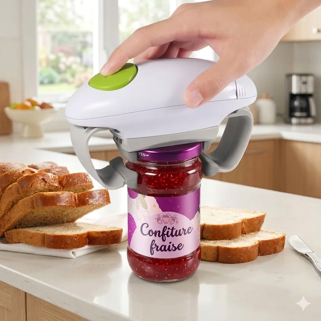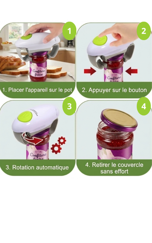Fini les efforts et la frustration ! Cet ouvre-bocal électrique révolutionnaire vous offre une liberté totale en cuisine. Ouvrez tout en un clin d'œil, sans douleur ni tracas.