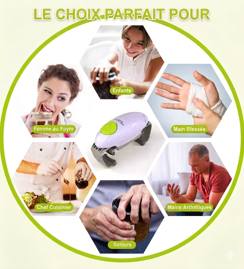 Absolument! Notre ouvre-bocal électrique est conçu pour la simplicité. Un seul bouton, une prise en main ergonomique, et voilà! Fini les efforts, bonjour la facilité, même pour les mains les plus délicates.